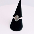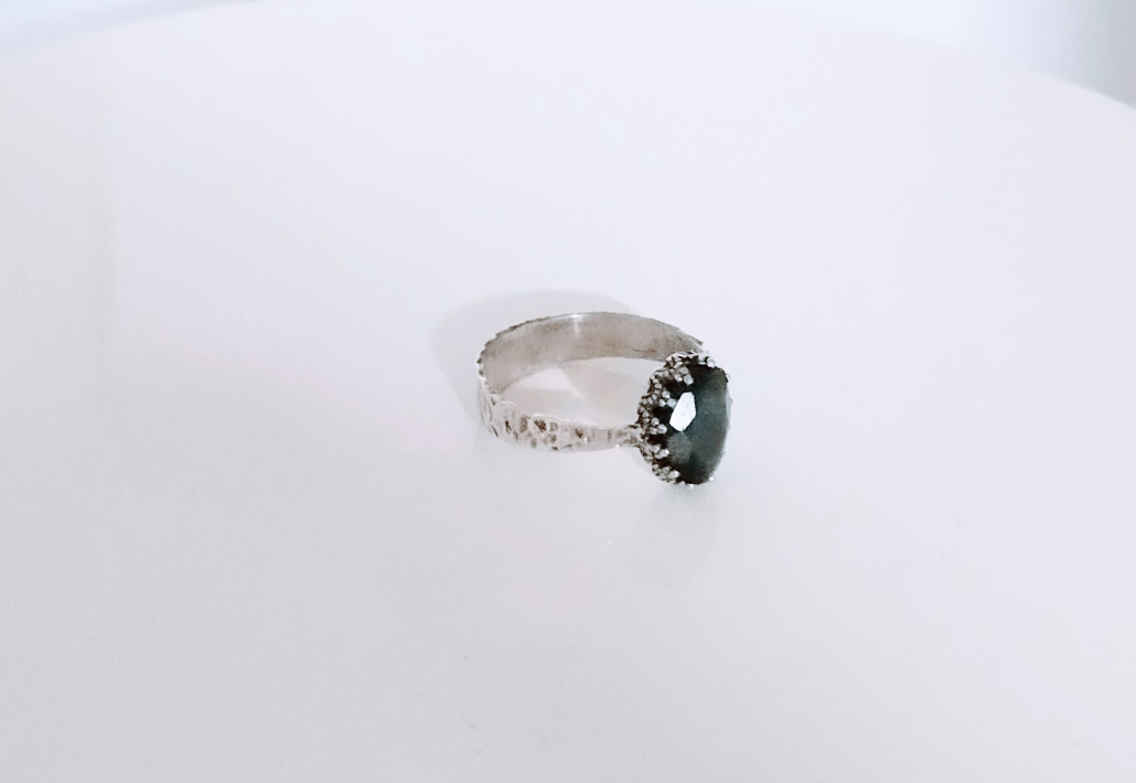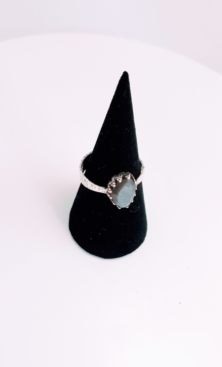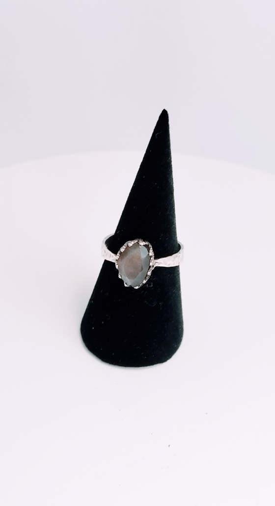 Ontdek de betoverende schoonheid van deze unieke zilveren ring. De ring is voorzien van een prachtige, ovaal geslepen grijzen maansteen die bekend staat om zijn mysterieuze glans. De band va de ring heeft een hamerde textuur, wat zorgt voor een store, ambachtelijke uitstraling. De steen is gezet in een gedetailleerde zetting die de natuurlijke vorm perfect accentueert. Een tijdloos sieraad met een bohemian touch.